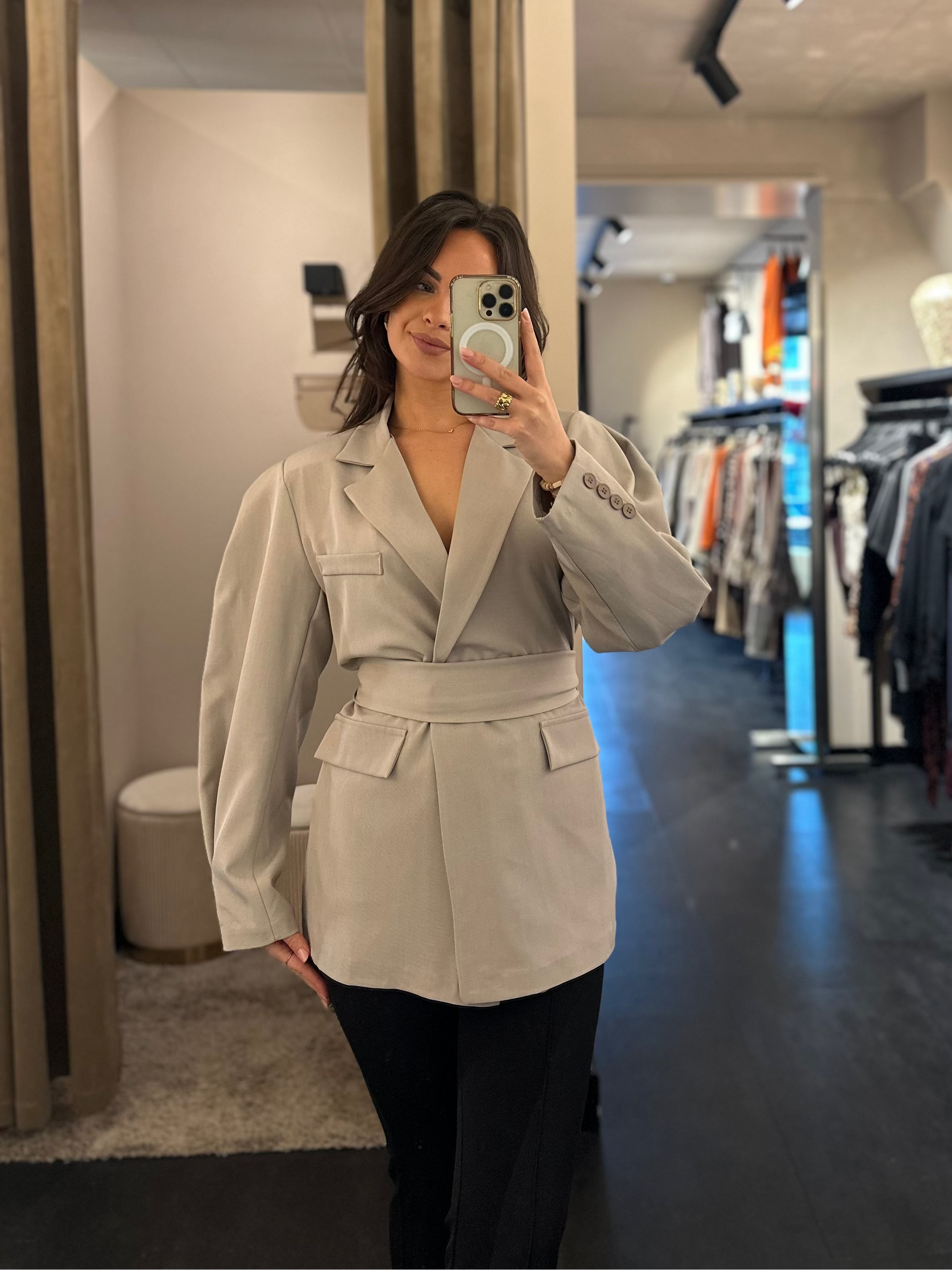 Mooie blazer in de kleur taupe met oversized fit voor een relaxte look π€β¨ Plooien op de mouwen en afgewerkt met leuke knopen als stijlvol detail π« Als finishing touch zit er ook een leuke sjaal bij om je outfit compleet te maken π§£π Perfect voor een chique en comfortabele stijl π