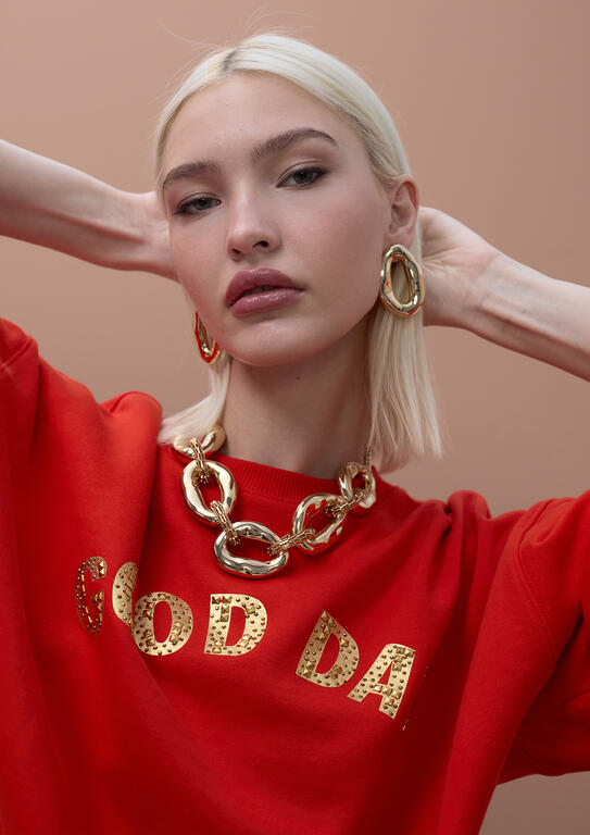 Fleece sweatshirt with a crew neck and 'Good Day' text front. Crafted from soft cotton for a comfortable, relaxed fit. Features ribbed trims at the neck, cuffs, and hem. Perfect for casual days with a touch of positivity.