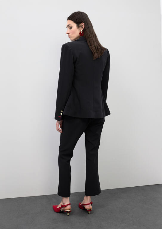 Slim fit pants with flare design and cropped cut, crafted in elastic fabric. Features button closure and concealed zipper. Ideal for casual and elegant styles, easy to pair in any season. Metallic logo detail at the waist.