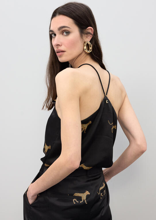 Satin camisole with animal print. Features thin straps and V-neckline. Perfect for pairing with evening outfits or special events. Lightweight and elegant, it instantly adds sophistication to any ensemble.